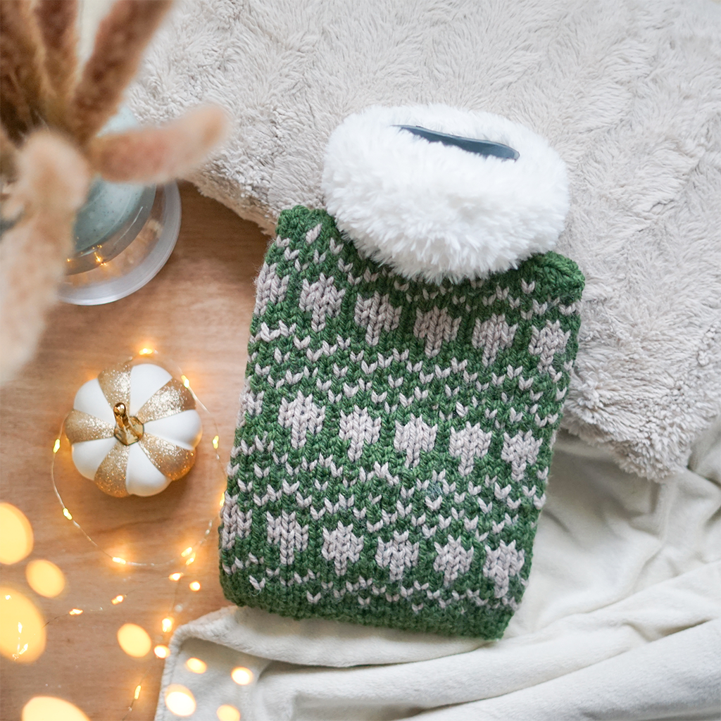 Geïnspireerd op deze stijl, maakte ik de Wildwood – kruikzakhoes. Een kruikhoes met (uiteraard) er bomen in verwerkt en nog ruiten. De hals is gebreid met furry garen ,waardoor je de kruikhoes zo dicht mogelijk tegen je aan wilt hebben voor de momenten op de bank of ’s avonds in bed.