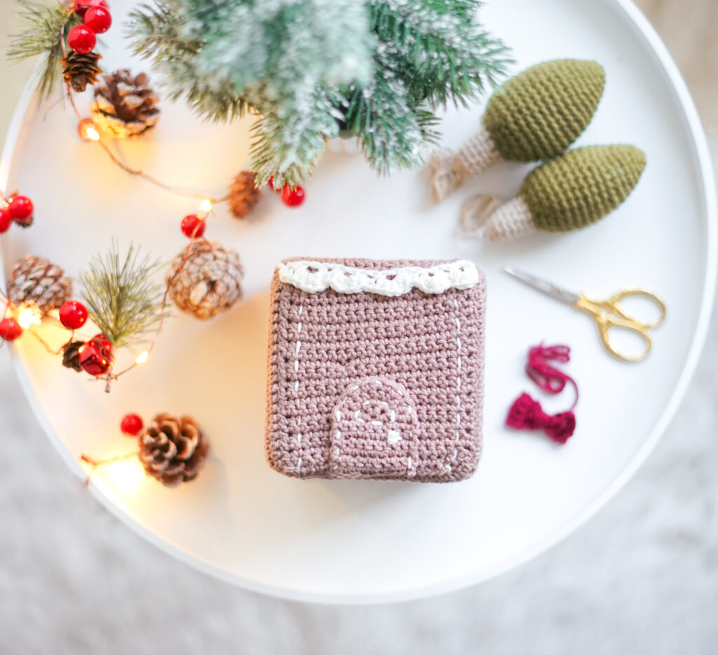 Bij kerstdecoratie zijn peperkoekhuisjes een van mijn favoriete items. Ze zien er altijd zo gezellig uit. Aangezien de Ruldolph the Reindeer – mugcozy op Yarnsea zoveel leuke reacties opriep, dat toen ik hen mijn idee voor een peperkoekhuisje vertelde, ze mij gelijk een pakketje garen opstuurde om uit te proberen. Rond die tijd werkte ik nog aan de gnoom, maar zodra die van mijn naald afkwam, begon ik aan de peperkoek-cadeauhuisje, of welke naam je er ook aan kunt geven. Het wordt dus een gehaakte cadeau en peperkoekhuisje in een verpakking. Hoe vind jij het worden?
