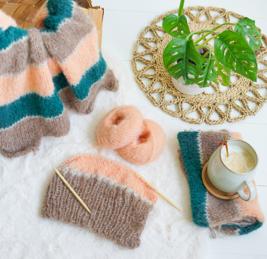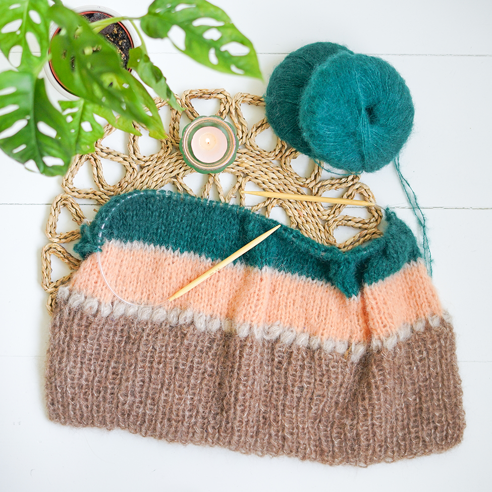 Na al de uren die ik aan het magazine heb besteed, was het zo fijn om ter afwisseling ’s avonds aan een breiproject te werken. Heel herkenbaar waarschijnlijk, ging ik eerst duiken in mijn garenvoorraad. Toen vond ik een grote hoeveelheid zachte bolletjes @dropsdesign Brushed Alpaca Silk. De enige kleur die ik nog heb toegevoegd is de kleur ‘Zoete Abrikoos’. Het matcht zo geweldig met het bruin en bosgroen. De basis zijn mijn veelgebruikte kleuren, maar door de kleur die ik heb toegevoegd is de look nét even anders. Ik ben verrast over de kleurencombinatie. En met breinaalden 6 mm heb je in no-time resultaat.